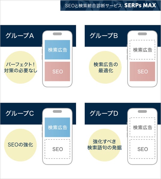SERPs MAXの初期診断を実行することで、検索語句のグループごとに4つのタイプに大きく分けられます。それぞれのグループに対して、注力すべき検索語句や、検索広告における打ち手などをご提案致します。