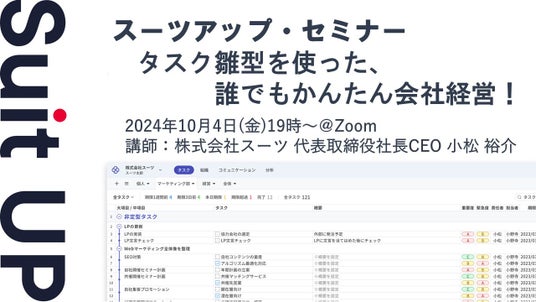 株式会社スーツ(所在地:東京都千代田区、代表取締役社長CEO:小松 裕介)は、2024年10月4日(金)19時から、当社代表の小松が講師を務めるスーツアップ・セミナー「タスク雛型を使った、誰でもかんたん会社経営!」を無料開催します。