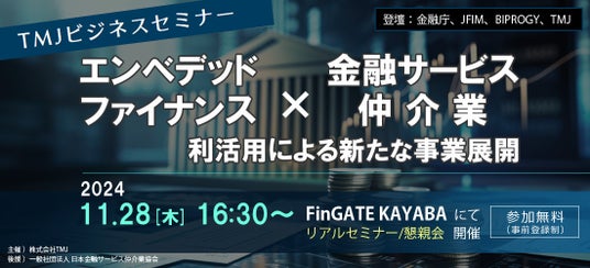 コンタクトセンター・バックオフィス(事務処理センター)の構築・運営を行うセコムグループの株式会社TMJ(本社:東京都新宿区、代表取締役社長:丸山 英毅、以下TMJ)は、一般社団法人 日本金融サービス仲介業協会 (東京都中央区、略称JFIM)の後援で『エンベデッドファイナンスと金融サービス仲介業の利活用による新たな事業展開』と題し、2024年11月28日にセミナーを開催します。
