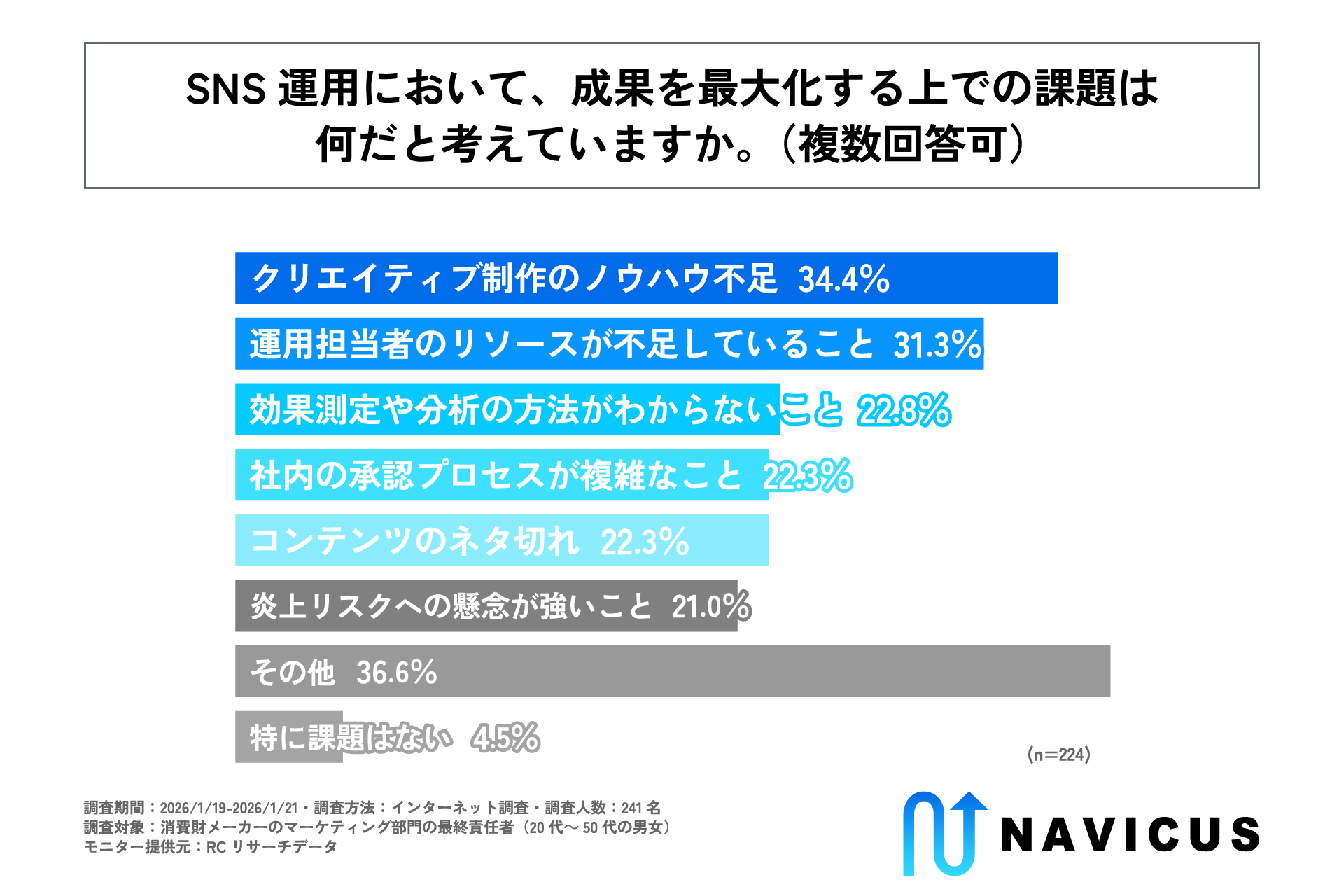 - SNS運用において、成果を最大化する上での主な課題は「クリエイティブ制作のノウハウ不足」や「運用担当者のリソース不足」
