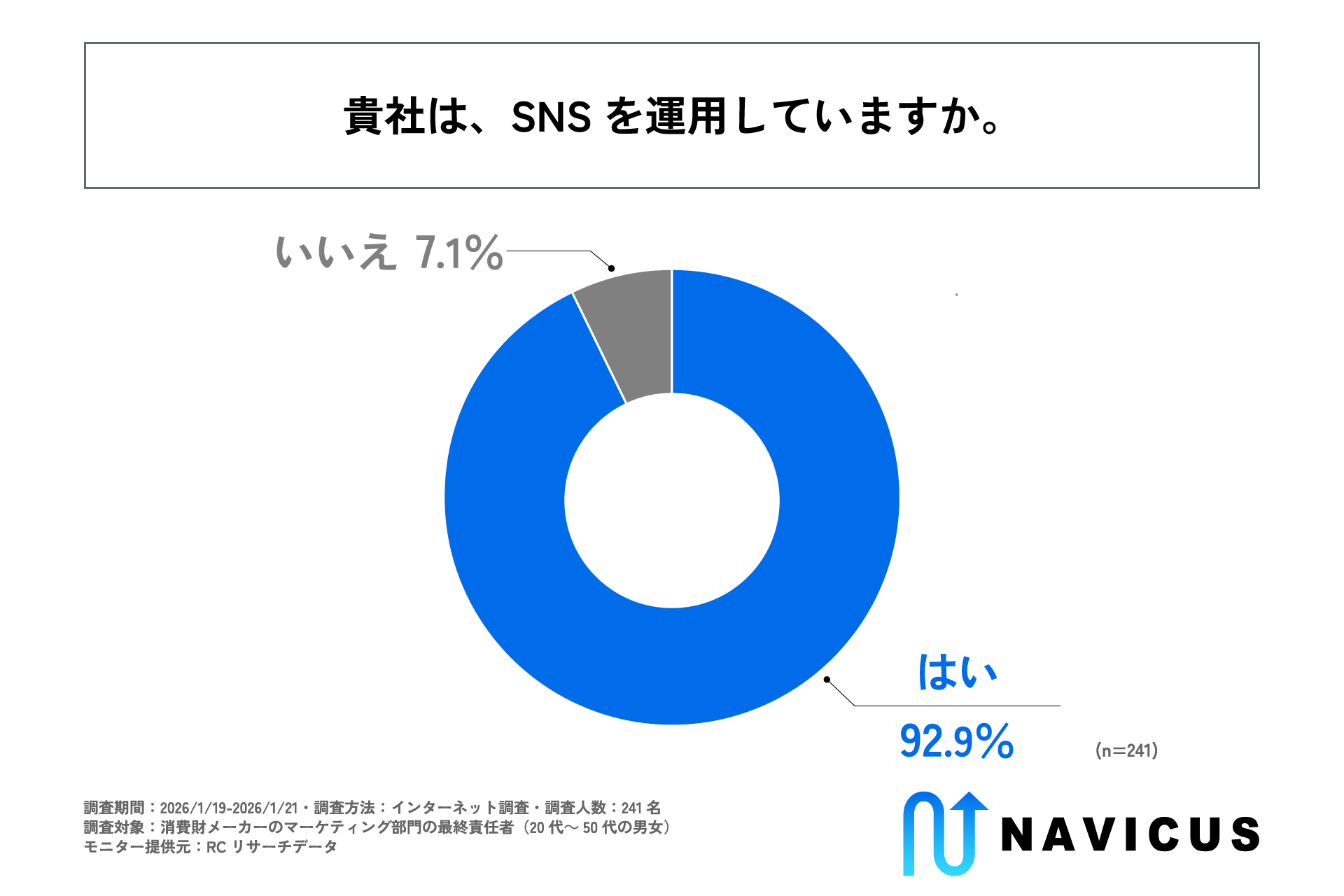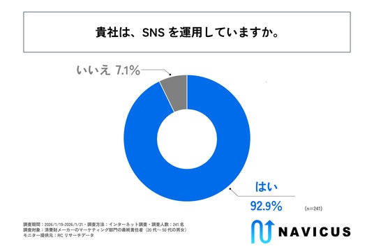 SNS戦略設計を軸に企業様や地方自治体様のコミュニケーション支援サービスを提供する株式会社NAVICUS(本社:東京都千代田区、代表取締役:武内 一矢、以下:NAVICUS)は、消費財メーカーのマーケティング部門の最終責任者(20代~50代の男女)を対象に「消費財メーカーのSNS運用に関する調査」を実施しました。この調査から、消費財メーカーにおけるマーケティング部門最終責任者のSNS運用に対する重要度の認識や求める成果、現在の運用における課題などが明らかになりました。消費財メーカーにおいて、SNS活用はマーケティング活動の標準的な施策として定着しました。しかし、各社がSNS運用に多くのリソースを投じる中で、その運用目的が「新情報の告知・拡散」にあるのか、あるいは「顧客からの意見収集・対話」にあるのか、その位置付けや評価基準は企業ごとに一様ではありません。また、各社がSNSにどのような役割を期待し、どのような運用が行われているのか、その実態は明らかになっていません。そこでNAVICUSは、消費財メーカーのマーケティング部門の最終責任者を対象に、現在のSNS運用の実態を明らかにするための調査を実施しました。