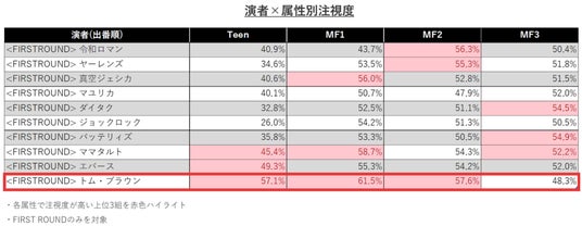 演者×属性別の注視度ではトムブラウンが幅広い世代でハイスコアを獲得!