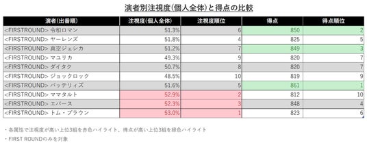 FIRST ROUND演者別の注視度は終盤に近づくにつれ上昇