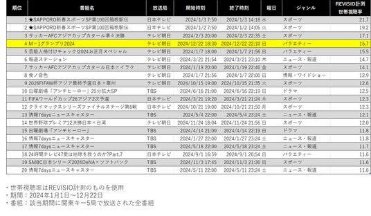 REVISIOの視聴データ公開サイト「RE.Source」では、過去1週間の関東・関西地域での地上波6局7チャンネルの世帯視聴率・注目度を毎日更新中。どなたでも無料でご覧いただけます(注目度をご覧頂く際はお名前とメールアドレスの登録が必要です)。年末年始特番の最新視聴率・注目度はこちらからチェックしてみてください。