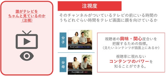 テレビの前にいる時間(滞在時間)のうち、テレビ画面に視線を向けていた時間(注視時間)の割合を表します。シーンに注目している度合いがわかります。