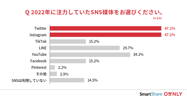 SNSマーケティングプラットフォーム「OWNLY」(オウンリー)を開発・運営するスマートシェア株式会社(渋谷区、代表取締役 西山統)は、2023年1月16日~2023年1月20日に事業会社や広告代理店に勤務する131名を対象に、SNSマーケティングの企業動向について調査を実施しました。