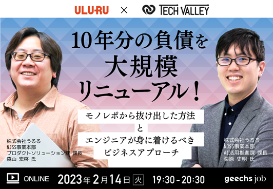 労働力不足問題解決のリーディングカンパニーとして、複数のSaaSサービスを展開する株式会社うるる(東京都中央区 代表取締役社長:星 知也、以下「うるる」)は、2023年2月14日(火)19:30~20:30にて、ギークス株式会社(本社:東京都渋谷区、代表取締役CEO:曽根原 稔人、以下ギークス)のエンジニアに向けたオンラインセミナー「10年分の負債を大規模リニューアル!『モノレポから抜け出した方法』と『エンジニアが身に着けるべきビジネスアプローチ』」に登壇します。
