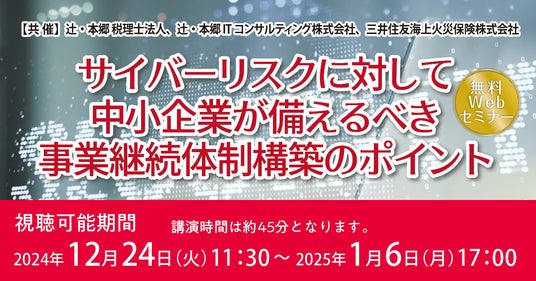 辻・本郷 税理士法人(本社:東京都新宿区、理事長:徳田孝司)は、辻・本郷 ITコンサルティング株式会社(本社:東京都渋谷区、代表取締役社長:黒仁田健)と三井住友海上火災保険株式会社(本社:東京都千代田区、取締役社長:舩曳 真一郎)の共催で、2024年12月24日(火)より「サイバーリスクに対して中小企業が備えるべき事業継続体制構築のポイント」セミナーを開催いたします。本セミナーでは、昨今のセキュリティインシデントから課題を確認し、企業が備えるべき対策についてわかりやすく解説します。また、経営者に求められる責任と、事業継続体制構築のポイントについても詳しく説明します。