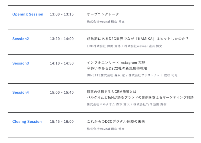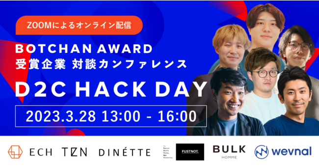 BX プラットフォーム「BOTCHAN」を運営する株式会社 wevnal(本社:東京都渋谷区、代表取締役社長:磯山 博文、以下 wevnal )は、2023年1月に発表した「BOTCHAN AWARD 2023」受賞企業のうち5社が登壇する「D2C HACK DAY」の開催をお知らせいたします。