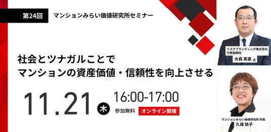 大和ハウスグループの大和ライフネクスト株式会社(本社:東京都港区、代表取締役社長:齋藤 栄司) の分譲マンション総合研究所「マンションみらい価値研究所」は、マンションのみらいを考える無料WEBセミナー