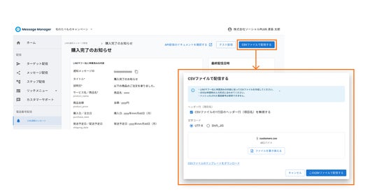 LINE通知メッセージの導入支援サービスにおいて「CSVアップロード機能」を追加したことで、ソーシャルPLUSが提供するLINEの配信ツールの操作画面からLINE通知メッセージの配信が可能になりました。