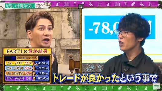 アドバイスに加え、テスタ校長が3人の生徒の取引を採点していきます。3人の点数は一体何点になるのでしょうか、取引経過から最終発表まで目が離せません。
