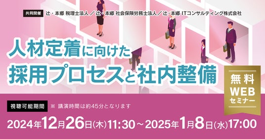 辻・本郷 税理士法人(本社:東京都新宿区、理事長:徳田孝司)は、辻・本郷 社会保険労務士法人(本社:東京都新宿区、代表社員:高橋紀行)と、辻・本郷 ITコンサルティング株式会社(本社:東京都渋谷区、代表取締役社長:黒仁田健)の3社共催で「人材定着に向けた採用プロセスと社内整備」セミナーを開催いたします。