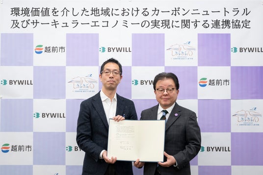 日本全国47都道府県のカーボンニュートラル実現を目指す株式会社バイウィル(本社:東京都中央区、代表取締役CEO:下村 雄一郎、以下「バイウィル」)は、福井県越前市(市長:山田 賢一、以下「越前市」)と、地域におけるカーボンニュートラルの実現に向けた連携協定を締結しました。本協定をもとに、J-クレジット(*1)をはじめとした環境価値の創出に取り組み、さらに新たなビジネスモデルの開発など事業の推進を通じて連携を強化することで、越前市のゼロカーボンシティ実現に貢献します。