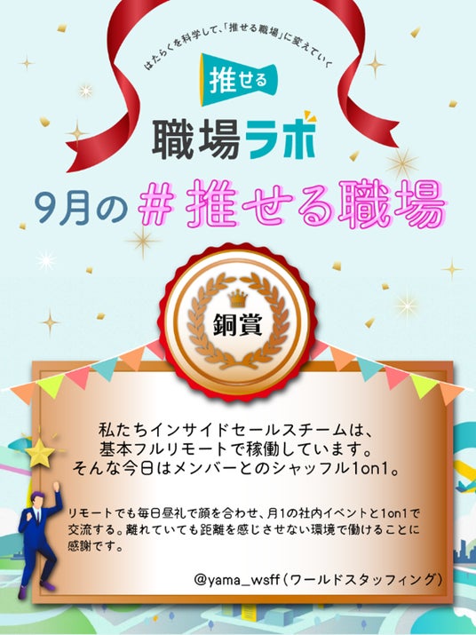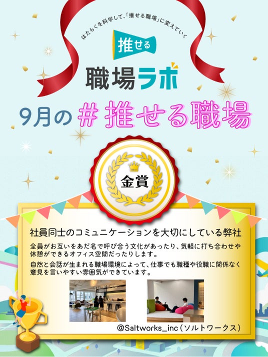 https://new-one.co.jp/ 以下、NEWONE)は、「推せる職場ラボ」公式Xアカウントを通じて実施しているキャンペーンの9月度月間賞を決定しました。9月度の受賞者として、金賞には、株式会社ソルトワークス、銀賞に株式会社MACオフィス、銅賞に株式会社ワールドスタッフィングを選出し表彰し、それぞれの取り組みを表彰しました。