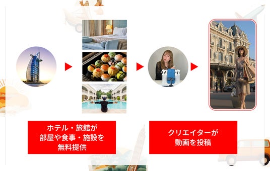 施設が無償提供する部屋や食事を活用し、旅行系クリエイターが滞在・撮影・投稿。