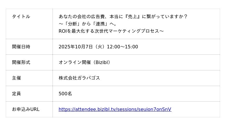 【2025年10月7日(火)】ガラパゴス主催オンラインカンファレンス開催:あなたの会社の広告費、本当に『売上』に繋がっていますか?「分断」から「連携」へ。