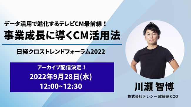 当セミナーでは、テレシー取締役COO川瀬が登壇し、「データ活用で進化するテレビCM最前線!事業成長に導くCM活用法」をテーマに、今後ますます高くなるテレビCMの可能性を語り、どのようにテレビCMを事業成長と直結させるのかを解説いたします。