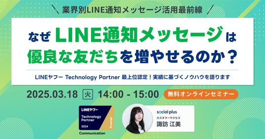 2025年3月18日(火)、株式会社ソーシャルPLUS(所在地:東京都港区、代表取締役:佐藤 亮介)はオンラインセミナー「なぜLINE通知メッセージは優良な友だちを増やせるのか?~業界別LINE通知メッセージ活用最前線」を開催いたします。