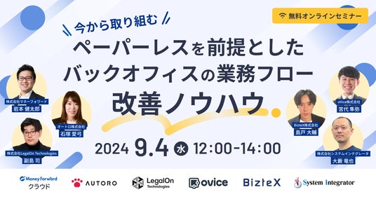 株式会社システムインテグレータ(本社:さいたま市中央区、代表取締役社長:引屋敷 智、東証スタンダード:証券コード 3826)は、株式会社マネーフォワード(東京都港区、 代表取締役社長 CEO:辻 庸介)が 2024年9月4日(水)に開催する「今から取り組む 「ペーパーレス」を前提としたバックオフィスの業務フロー改善ノウハウ」と題した無料ウェビナーに登壇することをお知らせします。
