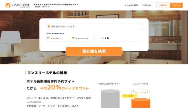 1. 7日間以上、半年までの長期予約がリーズナブルな長期滞在専門ホテル予約サイトです。サイト内には、長期利用が可能なホテルのみが掲載され、現地決済にも対応。1泊当たりの宿泊値(ADR)の最安値より20%以上割引したお得なプランを提供します。会員登録費や水光熱費など無駄な手数料もかかりません。