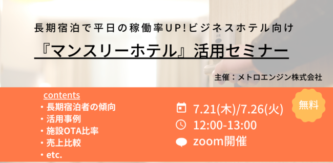 宿泊施設向けレベニューマネジメントツール『メトロエンジン』を提供し、DX化や集客支援を行うメトロエンジン株式会社(本社:東京都港区、代表取締役CEO:田中良介、以下メトロエンジン)は、7月21日(木)と26日(火)に、訪日台湾人向けの旅行情報サイト『トラベルバー』を運営する、BEENOSTravel株式会社(本社:東京都品川区、代表取締役CEO:竹内拓、以BEENOSTravel)と連携し開発・提供するOTAサイト『マンスリーホテル』の実績を元に、「~長期宿泊で平日の稼働率UP!ビジネスホテル向け~『マンスリーホテル』活用セミナー」を開催いたします。