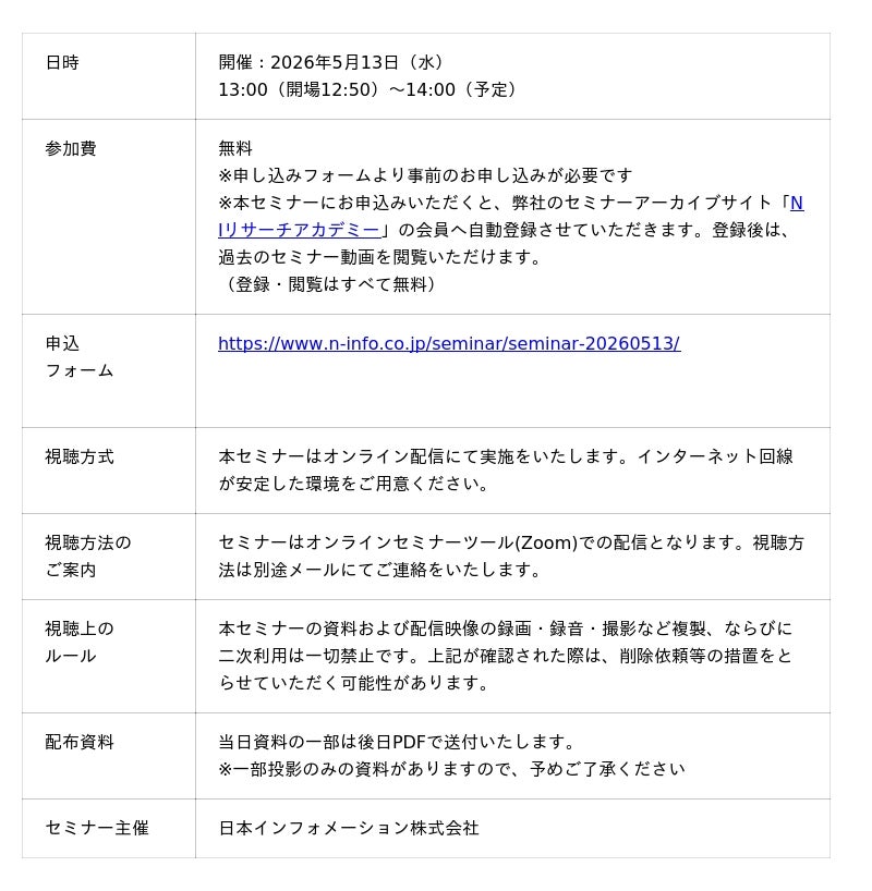 総合マーケティングリサーチ会社の日本インフォメーション株式会社(本社:東京都中央区、代表取締役社長:斎藤啓太)は、2026年5月13日(水)13:00よりトランスコスモス・アナリティクス株式会社エグゼクティブフェローの萩原雅之氏を講師にお迎えして、無料オンラインセミナーを開催します。
