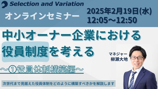 https://sele-vari.co.jp/ )は中小オーナー企業における役員制度を考える~1.役員体制構築編~セミナーを2025年2月19日(水)12:05~12:50に開催することをお知らせいたします。