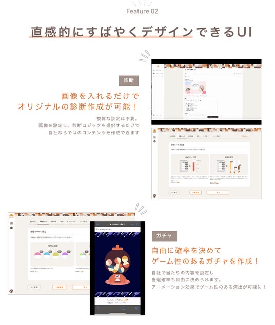 自社ならではのコンテンツを自由にカスタマイズして、ガチャや診断を作成できます。