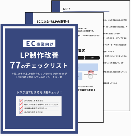 株式会社free web hope(本社:東京都中央区、代表取締役:相原ゆうき)は、ランディングページの改善点を簡単に見つけ出すためのお役立ち資料「EC事業者向け LP制作改善 77のチェックリスト」を無料公開いたしました。(