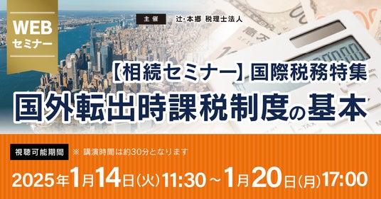 辻・本郷 税理士法人(本社:東京都新宿区、理事長:徳田孝司)は、2025年1月14日(火)より「【相続セミナー】国際税務特集 国外転出時課税制度の基本」セミナーを開催いたします。