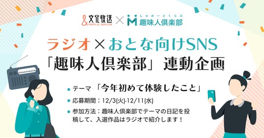 国内最大級(会員数40万人※)のシニア向けコミュニティサービス『趣味人倶楽部』(しゅみーとくらぶ)は、文化放送が運営するラジオ番組「オトナのホンネ~気になる火曜日~」と連動したラジオ×日記連動企画を実施します。
