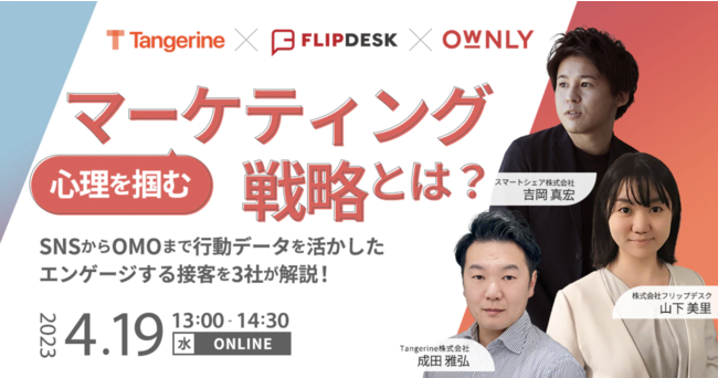 SNSマーケティングプラットフォーム「OWNLY」(オウンリー)を開発・運営するスマートシェア株式会社(東京都渋谷区、代表取締役 西山統)は、Tangerine株式会社(東京都港区、代表取締役 平井 清人)、株式会社フリップデスク(東京都港区、代表取締役社長 佐々木 忍)と2023/4/19(水)にオンラインセミナーを開催いたします。