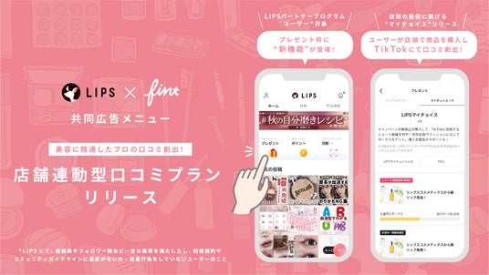 株式会社FinTは(本社:東京都渋谷区、代表取締役:大槻祐依)は、株式会社AppBrewが運営する美容プラットフォーム「LIPS(リップス)」と共に、店頭の販促に繋げる共同広告メニュー「店舗連動型口コミプラン」をリリースしました。「店舗連動型口コミプラン」は、美容に精通した”LIPSパートナープログラムユーザー*”を対象に、アプリ内に「マイチョイス」新機能を設置。”LIPSパートナープログラムユーザー”が、対象商品を店頭で購入し、質の高い口コミをTikTok上で創出する店頭販促プランとなっております。