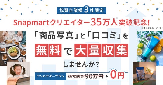 クリエイターとの共創を通じて企業のマーケティング課題を解決する、株式会社CREAVE(本社:東京都千代田区、代表取締役社長:中村真奈、以下 CREAVE)は、自社が運営する「Snapmart(スナップマート)」の登録クリエイター数35万人突破*を記念し、協賛企業様を3社募集します。