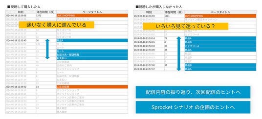また、SprocketのN1分析で、動画視聴後に購入に至ったユーザーと購入に至らなかったユーザーのサイト内行動を比較したところ、購入したユーザーは動画視聴後に迷わず購入に進んでいるのに対して、購入しなかったユーザーはいろいろな商品を見て迷っている様子が見てとれました。