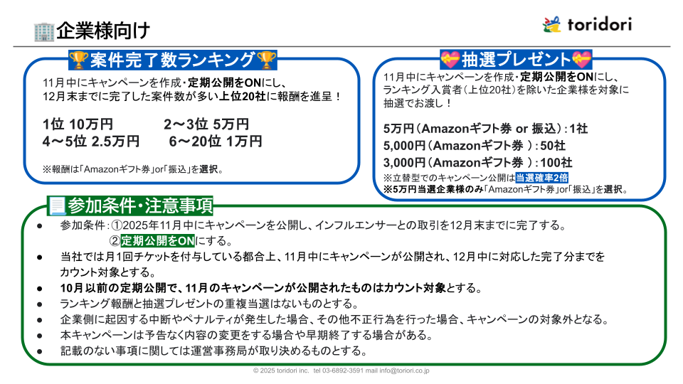 企業様の参加条件は1.2025年11月中にキャンペーンを公開し、インフルエンサーとの取引を12月末までに完了すること2.キャンペーンの定期公開をONにすることが必要です。