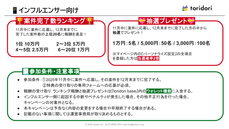11月中に案件を公開し、12月末※までに案件を完了した件数が多かった上位20社/インフルエンサー20名に報酬を進呈いたします!