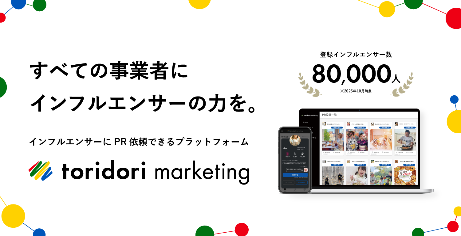 インフルエンサーマーケティングプラットフォーム『toridori marketing/toridori base(トリドリマーケティング/トリドリベース)』を中心としたインフルエンサーマーケティング事業を手がける株式会社トリドリ(本社:東京都渋谷区、代表取締役社長CEO:中山貴之、証券コード:9337、以下toridori)は、11月1日(土)~30日(日)の1ヶ月間「toridori base登録ユーザー8万人突破記念キャンペーン」を実施することをお知らせいたします。