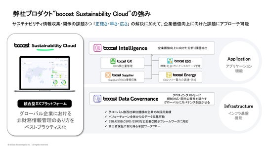 To address the evolving mandatory sustainability disclosure requirements for large global enterprises -including compliance with ISSB (International Sustainability Standards Board), CSRD (Corporate Sustainability Reporting Directive), and SSBJ (Sustainability Standards Board of Japan)- we have enhanced our Sustainability Cloud version. In this enhanced version, we have implemented two new features - “booost Data Governance” and “booost Intelligence”- designed to strengthen three key areas: "faster sustainability disclosure" through efficient and accurate data collection, "internal controls" for obtaining third-party assurance based on global governance, and "advanced sustainability data analysis" to identify issues from aggregated data and inform management strategies.