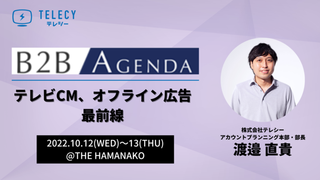 https://telecy.tv/ )を運営する株式会社テレシー(東京都渋谷区、代表取締役CEO:土井 健)は、2022年10月12日~13日にTHE HAMANAKO(静岡県浜松市)にて開催される、株式会社ナノベーション(本社:沖縄県読谷村喜名 2346-11 読谷村地域振興センター、代表取締役:中野博文)主催の「B2Bアジェンダ2022」 (