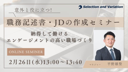 https://sele-vari.co.jp/ )は「意外と役に立つ職務記述書・JDの作成セミナー~納得して働ける、エンゲージメントの高い職場づくり~」セミナーを2025年2月26日(水)13:00~13:40に開催することをお知らせいたします。