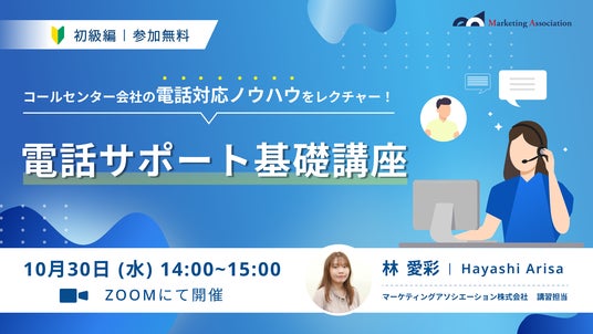 コールセンター代行サービスを提供するマーケティングアソシエーション株式会社(本社:東京都台東区 代表取締役:中園広和)は、2024年10月30日(水)に、ウェブセミナー『コールセンター会社の対応ノウハウをレクチャー!電話サポート基礎講座(初級編)』を開催します。