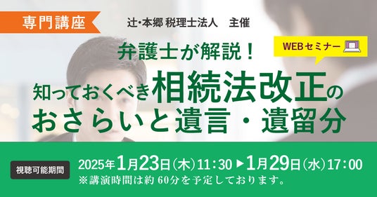 辻・本郷 税理士法人(本社:東京都新宿区、理事長:桑木小恵子)は、2025年1月23日(木)より「【専門講座】弁護士が解説! 知っておくべき相続法改正のおさらいと遺言・遺留分」セミナーを開催いたします。昭和55年の改正後、平成30年7月に約40年ぶりとなる相続法の大幅な改正が行われ、平成31年1月から段階的に施行されてきました。本セミナーでは、その多岐にわたる法改正の概要のおさらいと、相続において問題となりがちな遺言能力の有無の判断基準及び遺留分の算定方法について、事例をもとに弁護士が詳しく解説します。