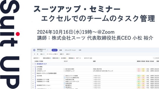 株式会社スーツ(所在地:東京都千代田区、代表取締役社長CEO:小松 裕介)は、2024年10月16日(水)19時から、当社代表の小松が講師を務めるスーツアップ・セミナー「エクセルでのチームのタスク管理」を無料開催します。