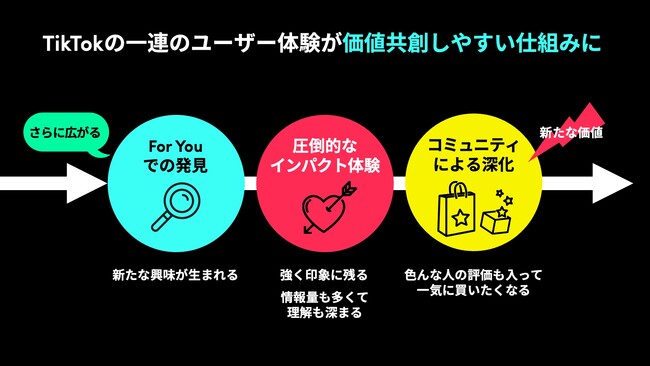 TikTokでは、「おすすめフィード」で次々と新しい動画をレコメンドされることで新たなものに興味を持ち、フルスクリーン、サウンドオンによるインパクトのある体験が記憶に残り、他ユーザーの動画やコメントによって新しい価値が生まれ、それがさらにおすすめフィードによって広がります。このようなTikTokでの一連の体験が、