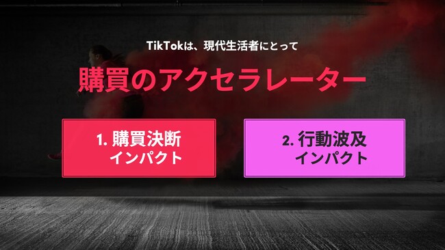 そして、生活者ニーズとTikTokでのエンターテインメント体験が合致した時、ユーザーの購買行動は加速していきます。その購買行動を加速させる2大要因が