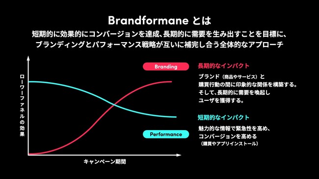 「Brandformance(ブランドフォーマンス)」をご紹介しました。「Brandformance」とは、短期的かつ効果的にコンバージョンを達成し、長期的に需要を生み出すことを目標に、ブランディングとパフォーマンス戦略が互いに補完し合う全体的なアプローチのことです。