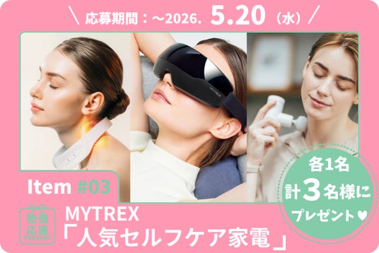 独自の技術で本格的なおうちケアを叶えてくれる、今話題のヘルスケアブランド、MYTREX(マイトレックス)より、1.身体をほぐすハンディガン「REBIVE MINI XS2」、2.首のコリにアプローチする「DR. HEAT NECK」3.疲れた目をやさしく労わる「「iRhythm」、の3アイテムを各1名様にプレゼント!