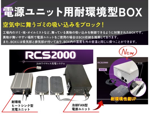 2kW電源ユニット用耐環境BOX取付RCS600/RCS1000シリーズは業界トップクラスの耐環境性を実現!!AGV側の充電ユニットはリリース当初より強制冷却やフィルター交換を必要としない耐環境仕様でしたが、ステーション側の電源ユニットもヒートシンク型の耐環境仕様を追加して